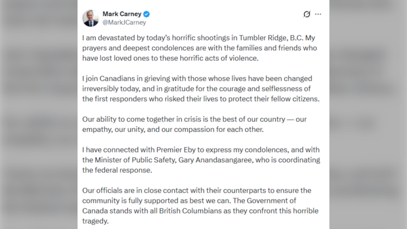 “Our hearts and prayers are with the community of Tumbler Ridge and all of British Columbia today,” he wrote. “My personal prayer is that in these difficult times, they find the peace and comfort that only He can provide.”