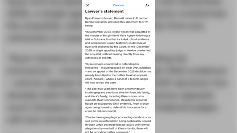 Kiara’s aunt, Tanya Agnew, says a statement sent to CTV News from Ryan Friesen’s lawyer was posted to the Facebook group. After the post, Agnew alleges that a copyright infringement was filed online by lawyer, Denise Brunsdon.