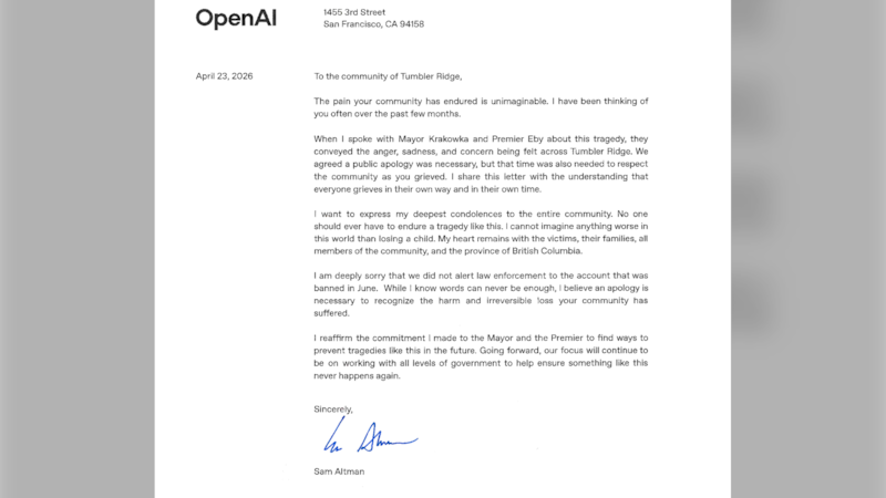 The apology letter was sent to a media outlet in Tumbler Ridge. In the letter, Altman reflects on February’s horrific mass shooting and expresses his deepest condolences to the entire community.