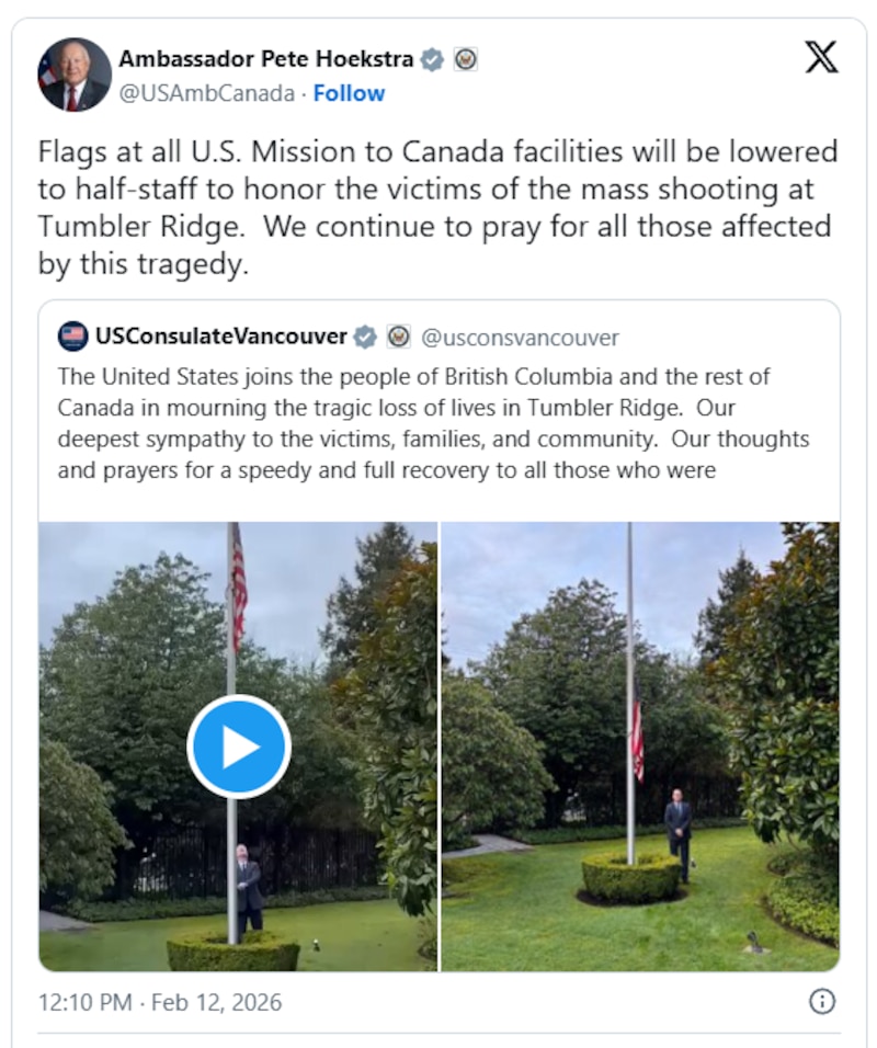 U.S. Ambassador to Canada Pete Hoekstra said in a statement on X that all flags at American consulate buildings in Canada will be flown at half-mast to honour the victims of the shooting.
